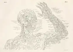 Paolo Mascagni (1752–1815) was the most celebrated anatomist of his day. Antommarchi became Prosector to Mascagni who left manuscripts and drawings for an intended publication of a comprehensive complete anatomy with life-size figures. Antommarchi prepared the publication but was meanwhile called to Saint Helena. Antommarchi left, taking with him three copies of Mascagni's plates. When Antommarchi returned, he published these plates, printed from lithographs, under his own name in a monumental work which appeared from 1823 to 1826 under the title of: "Planches anatomiques du corps humain exécutées d'après les dimensions naturelles accompagnées d'un texte explicatif".[25][26][27][28] The plates for the publication were drawn and possibly engraved by Antoine Seratoni.
