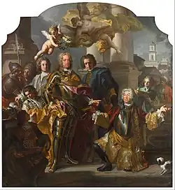 His large, efficiently structured atelier became a virtual academy, at the heart of cultural life in Naples. Among his many pupils were Giuseppe Bonito (1707–89), Domenico Antonio Vaccaro (1678-1745), Nicola Maria Rossi, Lorenzo De Caro, Andrea dell'Asta, Pietro Capelli, Domenico Mondo, Onofrio Avellino, Scipione Cappella, Giovanni della Camera,[5] Francesco Campora,[6] Alessandro Guglielmi,[7] Leonardo Oliviero,[8] Salvatore Olivieri,[8] Salvatore Pace,[9] Romualdo Polverino,[10] Paolo Gamba, Bernardino Fera, Evangelista Schiano, Gaspare Traversi, Santolo Cirillo, Michele Foschini, Tommaso Martini, Ferrante Amendola, Eugenio Vegliante, and most notably Corrado Giaquinto, Francesco De Mura and Sebastiano Conca. The Scottish portraitist Allan Ramsay spent three years in Solimena's studio.[11]