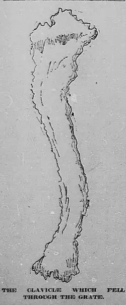 Hermans had asked his friend John Hanson, a Methodist-minister-turned-journalist, to be acting pastor during his absence.[17][19] Hanson had heard of Clawson's disappearance and harbored a suspicion that "something unusual had befallen the girl."[19] While at the church, Hansen decided to examine the basement. To his surprise, in the furnace he found several items under the grate in the ash receiver: two razors, an English-made butcher knife which Hermans kept in his kitchen, a garter buckle, a belt buckle and, most shockingly, human bones. Upon further examination, he noticed that there was blood on the furnace door, and the buckles were from Clawson's clothing.[1][17] Authorities were summoned and the bones sent for examination.[17] A box of poisonous drugs was found in Hermans' room.[20]