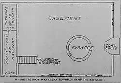 The next morning, Hermans asked the church's janitor, Mr. Johnson, to clean out the basement furnace and prepare it for a fire.[17] The weather was warm,[1] and the furnace hadn't been used since it had caused a blaze several years previously,[17] but the pastor said he wanted to check the flues before cold weather arrived.[1] Johnson took six buckets of coal to the basement and cleaned out the furnace. When he was about to start the fire, he was stopped by Hermans, who took over the project himself. This was just before noon. Hermans was soon running the furnace "full blast." An extremely foul odor emanated along with the fire's heat. During the afternoon, a young man living with his family in one of the apartments attached to the church was overcome by the heat and smell. He fell unconscious and had to be splashed with water in order to come back to his senses. His parents went to the basement to complain, but Hermans declined to shut off the furnace at that time. No one else entered the basement during the test of the furnace, but Mrs. Peterson saw Hermans carrying a large sack into the basement during that time, and others saw him carrying multiple sacks to the basement. Hermans eventually shut off the furnace around 6 pm. During the following months the furnace test would be largely forgotten.[17]