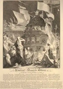 In March 1726, Hosier was sent to command a squadron on the Jamaica Station with orders to prevent Spain from shipping its treasures home.[7] Viscount Townshend, Secretary of State, consulted the former privateer Woodes Rogers, who was in London at the time, as to the probable means and route the Spaniards would adopt to get their treasure home. From past experience Rogers probably knew more than any other person then in England of the favoured Spanish tactics for evading detection. A report dated 10 November 1726, was delivered, in conjunction with Capt. Jonathan Denniss,[N 1] to prepare Hosier for his task.[8] At first Hosier met with success in his Blockade of Porto Bello. However, under strict orders not to attempt a capture of the town, which he could without difficulty have achieved with his 20 ships, he was forced to loiter and cruise off a mosquito infested coast. Yellow fever broke out and Hosier himself died of the fever (or as is said by some contemporary commentators "of a broken heart"), whilst on the Breda off Vera Cruz,[9] as did between 3,000 and 4,000 of his sailors. Eventually, during the 1730s, the government appeasement policies of men like Walpole, and not Hosier personally, were blamed for the disaster. The episode is described as follows in Percy's Reliques of 1765.
