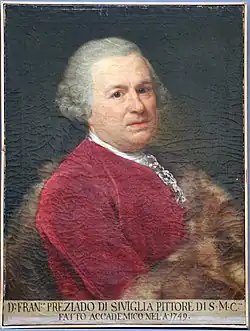 There he entered the school of Sebastiano Conca.[2] He painted some pictures in Rome, including a Holy Family for the church of Santi Quaranta Martiri e San Pasquale Baylon, Rome. Preciado painted both sacred subjects and portraits.[3] Philip V granted him an annual pension of 500 ducats in 1740, a decision influenced by the recommendation of Spain's minister plenipotentiary in Rome, Cardinal Troiano Acquaviva d'Aragona.