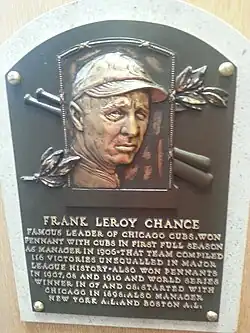 After falling short of induction in the Baseball Hall of Fame by seven votes in 1945,[59] Chance was elected to the Hall of Fame in the 1946 balloting by the Veterans Committee. Tinker and Evers were elected the same year.[60][61] Chance was also elected to the Fresno County Athletic Hall of Fame's first class, in 1959.[62][63]
