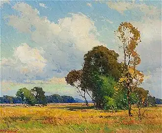 In 1891, he became involved in retouching a famous panorama by Paul Philippoteaux depicting the "Battle of Gettysburg", when it was being prepared for an exhibit in Chicago. He continued to perform this type of work throughout the 1900s and was involved in several projects that did not come to fruition. He never took it seriously and referred to it as "potboiling".[4] That same year, he and the landscape painter, Arthur Feudel (1857-1929) established a studio in Rockford. He also painted murals; notably in 1896 at the new Peoria Public Library, together with Hardesty Gilmore Maratta (1864-1924), an artist and paint manufacturer.[4] For several years after, he returned there periodically to teach drawing classes.[2]