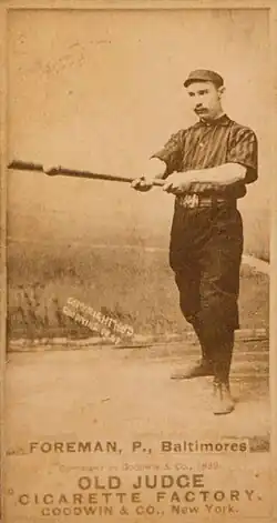 In 1889, Foreman played for the American Association's Baltimore Orioles. In 414 innings pitched, he had a 23–21 record, a 3.52 ERA, and 180 strikeouts. The 23 wins were his career-high in the major leagues.[1]