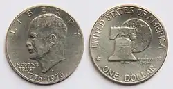 | Obverse: Eisenhower portrait, US national motto, Liberty on top, US Independence year (1776) and year of minting (1976). | Reverse: Liberty Bell in front of the Moon, country name, face value and E pluribus unum (Out of many, one). |