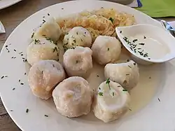 The sauce accompanying the knödel is made with grated Styrian kren, mixed with sour cream, vinegar, salt, and chives.[6]
