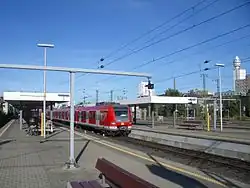 Frankfurt (Main) Süd (Frankfurt (Main) South) or Frankfurt Südbahnhof is one of three railway stations for long-distance train services in Frankfurt, Germany. Unlike Frankfurt Hauptbahnhof it is not a terminus but a through station, and has nine tracks with five platforms.[5] It is a stopping station for some long-distance routes (ICE, IC) and for regional traffic (Regional-Express and RegionalBahn). It is also one of the major rapid-transit railway hubs in the city with S-Bahn and U-Bahn services.