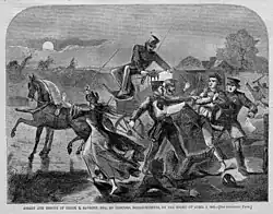 On the night of April 3, 1860, five federal marshals arrived at Frank Sanborn's home in Concord, Massachusetts, handcuffed him, and attempted to wrestle him into a coach and take him to Washington to answer questions before the Senate in regard to his involvement with John Brown. Approximately 150 townspeople rushed to Sanborn's defense, aroused by church bells. Judge Lemuel Shaw issued a writ of habeas corpus, formally demanding the surrender of the prisoner. In a letter to a friend, Louisa May Alcott wrote, "Sanborn was nearly kidnapped. Great ferment in town. Annie Whiting immortalized herself by getting into the kidnapper's carriage so that they could not put the long-legged martyr in."[11]