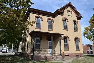 The Franklin County Sheriff's Residence and Jail is a historic building located in Hampton, Iowa, United States. The combination sheriff's residence and jail was the most common type of detention facility built by Iowa counties from the 1840s to around 1950.[2] In this facility in Hampton the sheriff's residence was the two-story Italianate style structure closest to the street. There was a cell on the second floor used for female or juvenile prisoners. The sheriff's wife generally provided the meals and laundry services for the prisoners from the residence. The small cell block for men and a women's holding cell was in the single-story wing off of the back of the house. The building was constructed by local attorney D.W. Dow, and P.J. Pauly & Bro. of St. Louis provided the cells. It was completed in 1880. The sheriff continued to reside here into the 1960s, and the building was used for a jail until 1988. It was individually listed on the National Register of Historic Places in 1996.[1] In 2003 it was included as a contributing property in the Hampton Double Square Historic District.[3]