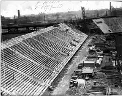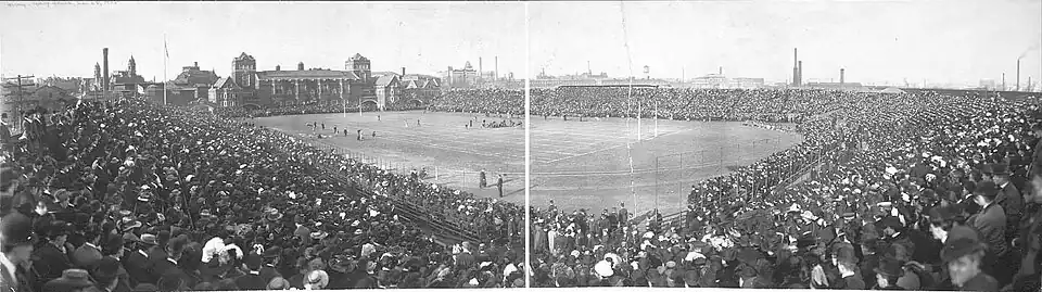 Franklin Field was built for US$100,000 (equivalent to $3,779,600 in 2024) and dedicated on April 20, 1895, for the first running of the Penn Relays.[6] The Field supplemented and eventually replaced the venue called University Grounds, which was located a few blocks west on a block bounded by Spruce Street (north), 38th Street (east), Pine Street (south), Woodland Avenue and 37th Street T-intersection (northwest). Its location was typically given as "37th and Spruce".[7]