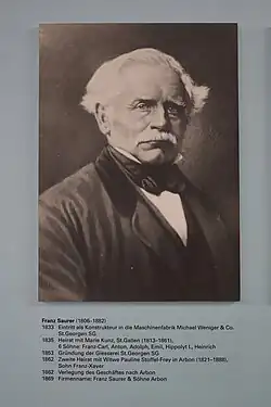 Franz Saurer (October 3, 1806 - November 28, 1882) was a German-born Swiss industrialist who founded the company which ultimately became the Adolph Saurer concern. He was also responsible for the positive economic development of the Arbon region. Through his estate his descendants endowed funds to build the city park of Arbon. He was the patriarch of the Saurer family.