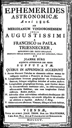During his career he published a number of treatises on astronomy and geography. He was deputy editor of the Ephemerides Astronomicae of Vienna from 1782 until he became editor in 1792. He continued as editor, collaborating with Joanne Bürg, until he retired in 1806. He made a series of measurements of celestial bodies, which were published from 1787 until 1806. These included the Tabulae Mercurii, Martis, Veneris, Solares.[1][2] He also carried out a long series of determinations of longitude that were noted for their accuracy.[4][5]: 265 [6]: 245