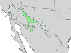 In Arizona, the range of Fraxinus velutina is centered on the Mogollon Rim, from the northwest in the Grand Canyon feeder canyons of southern Utah and Nevada, to the central-east White Mountains (Arizona) merging into the same mountainous area of western New Mexico, then to the Rio Grande valley south to trans-Pecos Texas. In Arizona and northern Sonora it also is found in the sky island mountain ranges, the Madrean Sky Islands, and is found from central-southern Arizona, in the Sonoran Desert mountains, and the desert ranges south into northern Sonora and the very north of the Sierra Madre Occidental cordillera of Sonora and Chihuahua. Scattered populations occur eastward through the Chihuahuan Desert regions of Chihuahua, Coahuila and Nuevo León.[5]