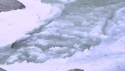 Frazil ice is a collection of loose, randomly oriented ice crystals a millimeter and sub-millimeter in size, with various shapes, e.g., elliptical disks, dendrites, needles and of an irregular nature.[1][2][3][4][5] Frazil ice forms during the winter in open-water reaches of rivers as well as in lakes and reservoirs, where and when the water is in a turbulent state, which is, in turn, induced by the action of waves and currents. Turbulence causes the water column to become supercooled, as the heat exchange between the air and the water is such that the water temperature drops below its freezing point (in order of a few tenths of °C or less).[3][5][6] The vertical mixing associated with that turbulence provides enough energy to overcome the crystals' buoyancy, thus keeping them from floating at the surface. Frazil ice also forms in oceans, where windy conditions, wave regimes and cold air also favor the establishment of a supercooled layer.[7][8] Frazil ice can be found on the downwind side of leads and in polynyas. In these environments, that ice can eventually accumulate at the water surface into what is referred to as grease ice.