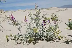 Two rare varieties endemic to California are federally listed under the Endangered Species Act; var. coachellae, the Coachella Valley milk vetch, is endangered and var. piscinensis, the Fish Slough milk-vetch, is threatened.[16]