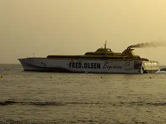 The HSC Bonanza Express is a 96-metre (315 ft) Incat fast catamaran, similar to the Bentago Express and the Bencomo Express, operated by the company on the route between Las Palmas de Gran Canaria and Arrecife (Lanzarote).[4] Introduced in 1999, it was the company's first fast ferry. The Bonanza Express was meant to be sold to Euroferries for a service between Ramsgate and Boulogne, but the deal fell through and the Bonanza Express has found its way back with Fred. Olsen Express in the Canary Islands.[5][6]