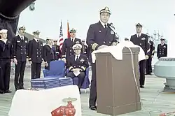 Moosally (at podium) speaks at a ceremony on USS Iowa on January 4, 1990, to unveil a plaque commemorating the 47 crewmen killed in the turret explosion on April 19, 1989.