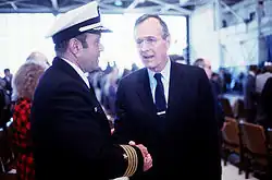 Moosally (left) greets President George H. W. Bush at the memorial ceremony at Norfolk on April 24, 1989.