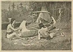 Remington continued sketching, but his results were still cartoonish and amateur. After less than a year, after he sold his ranch, he went home. After acquiring more capital from his mother, he returned to Kansas City to start a hardware business, but due to an alleged swindle, it failed, and he reinvested his remaining money as a silent, half-owner of a saloon. He went home to marry Eva Caten in 1884. (He had previously asked her father for her hand, but had been turned down—her father was a widower at the time and felt he needed Eva, but after he had remarried, was more amenable.)[21] The young couple returned to Kansas City immediately. Eva was unhappy with his saloon life and was unimpressed by the sketches of saloon inhabitants that Remington regularly showed her. When his real occupation became known, she left him and returned to Ogdensburg.[22] With his wife gone and with business doing badly, Remington started to sketch and paint in earnest, and bartered his sketches for essentials.