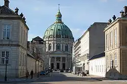 The section from the Marble Church to the waterfront makes up the so-called Amalienborg axis, the shorther but more prominent of the two axes on which the Frederiksstaden district is centred. At the central plaza of Amalienborg Palace, Frederiksgade intersects Amaliegade, the other, longer axis of the district. Jacques Saly's equestrian statue of Frederick V, in the centre of the plaza, is located directly on the intersection of the intersection of the two axes and looks towards the dome of the Marble Church.[1]