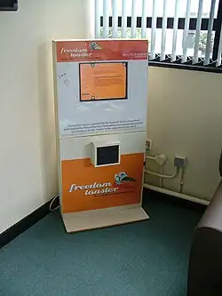 A Freedom Toaster is a public kiosk that will burn copies of free software onto user-provided CDs and DVDs.
