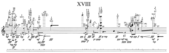 In 1977 Cage was approached by Betty Freeman, who asked him to compose a set of etudes for violinist Paul Zukofsky (who would, at around the same time, also help Cage with work on the violin transcription of Cheap Imitation). Cage decided to model the work on his earlier set of etudes for piano, Etudes Australes. That work was a set of 32 etudes, 4 books of 8 etudes each, and composed using controlled chance by means of star charts and, as was usual for Cage, the I Ching. Zukofsky asked Cage for music that would be notated in a conventional manner, which he assumed Cage was returning to in Etudes Australes,[2] and as precise as possible. Cage understood the request literally and proceeded to create compositions which would have so many details that it would be almost impossible to perform them. An example from one of the more difficult etudes follows: