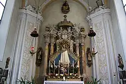 Trens is also a place of pilgrimage, the church is dedicated to the miraculous image of “Our Lady of the Avalanche”, the ancient wooden statue of the “Madonna standing and the Child”, dating back to 1470. According to a legend, a farmer found a wood-carved statue among the debris of a landslide and carried it to his house. The following day the statue was found in a chapel and the people began to venerate it. In a document dated 10 September 1345, it is mentioned for the first time of a church in Trens, in 1407 the family Trauston appointed a weekly Mass to be celebrated on Tuesday in the church. The present church was built in 1498 in Late Gothic with two main entrances; the priest of Stilves obtained a “littera indulgentiarum” from twelve cardinals in 1482 in order to ease the construction. The chaplain of the deanery of Trens received in 1648 the commission to say Mass every day in Trens and the pilgrimages to the church increased. The “Chapel of Our Lady” was inaugurated on 29 March 1728, and take place on the left side of the nave with the wall covered by the numerous votive offering. At the half of the 18th century, the church underwent a restoration in Baroque on a plan by Joseph Adam Ritter von Mölk. The miraculous image was crowned in 1928 and the church became a parish in 1939.[6]