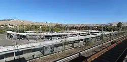 In April 1981, BART opened bidding for construction of an additional parking lot off Mowry Avenue on the north side of the station.[32] The interim gravel lot cost $173,000 to construct, plus $216,000 to acquire the land from Caltrans. It opened in March 1982 with approximately 500–600 spaces, increasing total capacity at the station to 1,500–1,600 spaces.[33][34] Later that year, BART installed canopies at the bus transfer area.[35][36] The Mowry Avenue lot was expanded and paved in 1986 using UMTA funds.[37][38] The older lots were reconfigured in 1987 to add 391 spaces, with a final count of 2,374 spaces.[39][40] The station was renovated in 1997, with the bus plaza expanded.[41]
