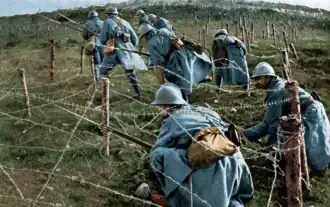 The Second Battle of Champagne, from 25 September – 6 November, was a general failure, with the French only advancing about 4 kilometres (2.5 mi), and not capturing the German's second line.[58] The French Official History recorded 191,795 casualties in the fighting in Champagne and Artois.[59]