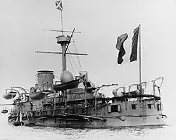 Her main armament consisted of two 340 mm (13.4 in), 21-caliber guns mounted in individual barbette mounts, one forward and one aft, both on the centerline.[6] Ammunition storage was intended to be eighty rounds per gun, but the need to save weight forced a reduction to forty shots per gun.[9] For defense against torpedo boats, she carried four 47 mm (1.9 in) 3-pounder guns and ten 37 mm (1.5 in) 1-pounder Hotchkiss revolver cannon, all in individual mounts. Her armament was rounded out with two 356 mm (14 in) torpedo tubes in above-water mounts.[6]