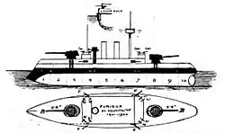 Furieux was designed in the late 1870s as part of a naval construction program that had begun under the post-Franco-Prussian War fleet plan of 1872. Initially, the French built two types of armored capital ships, the first, a series of high-freeboard barbette ships, and the second being smaller coast defense ships descended from the monitors that had been built in the 1860s.[1] Most of the initial series of coastal defense ships built under the 1872 plan featured a single gun turret with two large-caliber guns toward the bow similar to the breastwork monitors being built in the British Royal Navy at the time. The French ships included the four vessels of the Tonnerre and Tempête classes, which being built simultaneously in the early 1870s and were broadly similar. Their turrets were very large, with the guns widely spaced, to theoretically allow them to fire directly astern, one gun on either side of the superstructure. The Minister of the Navy, Louis Raymond de Montaignac de Chauvance, ordered a fifth vessel on 12 February 1875, to be named Furieux, nearly identical to Tonnerre, though with a slightly longer and narrower hull.[2]