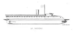 Taureau was the first coastal defence ship to serve with the French Navy (Marine Nationale). The ship was designed as a small manoeuvrable strike weapon to engage with the larger ships of the British Royal Navy.[1] As a pioneer for the type, the vessel was known by a number of names during her career. Initially, she was ordered as a screw-powered turret ship for the defence of roadsteads (batterie à hélice et à tour pour la defense des rades), but this was changed to Special project (Bâtiment spécial) in the January 1864 fleet list due to the unique nature of her design. As her launch date approached, she was given the same classification as monitors, coastal guard ship (garde-côtes cuirassé) in January 1865. A year later, she was named the sole first class coastal guard ship (garde-côtes cuirassé de 1er classe), although this was reverted to simply coastal guard ship two years later.[2] The vessel was also known as an armoured, ironclad or steam ram.[1][3][4]