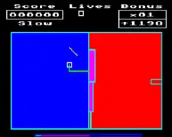 In Frenzy, a Lepton is captured if it is trapped in an area enclosed by the player's robot craft or if 95% of the screen area has been filled. The robot craft has two speeds and the score for filling in an area using only the slower speed is subject to a 2x multiplier. Chasers appear in higher levels which can collide with the player's robot craft, causing a life to be lost. The number of Leptons and Chasers increase as the levels progress, up to a maximum of five of each on the most difficult screens—except for Levels 12 and 14, which have a smaller number of Leptons (and no Chasers) but the Leptons move much faster. The player obtains an extra craft on completing the third, sixth and ninth screens.[1] It has been found[6] that after level 14, the last two screens repeat indefinitely.