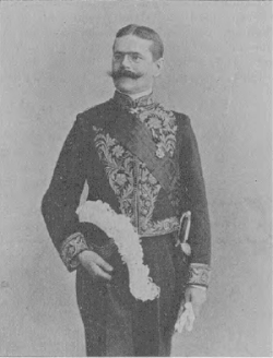 He was born in Amsterdam to parents who owned a confectionary and lunch room in the Kalverstraat. After graduating from secondary school he worked at his uncle's cigar factory for some time and as a tobacco trader on the Amsterdam exchange. In 1879 he took his consular exams and was admitted as a student-consul at the Foreign department and was stationed in Berlin from 1882 to 1883. He became vice-consul in Saint Petersburg in 1883, to be appointed Consul General in Tehran in 1889. He stayed in Tehran until 1895 and briefly was Consul general in Beijing. In 1902 he received a new appointment as Consul general in Tehran. In 1903 Mozaffar ad-Din Shah Qajar presented him with a beautiful grey. A very special photo of Knobel on this horse was published some years later.[1] Next to the horse stands his servant Reza, later to be known as Reza Shah Pahlavi.[2] In 1904 his government ordered his return to The Hague.