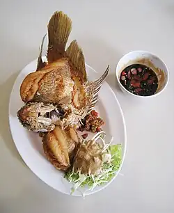 | Ikan goreng | An Indonesia and Malaysian dish of seasoned and deep-fried fish. Usually served with sambal chili paste or kecap manis (sweet soy sauce). Popular fish used include gourami, carp, milkfish, and red snapper. | |
