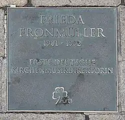 - ^ a b c d Harrassowitz, Hermann (2001). "Fronmüller, Frieda". In Herbst, Wolfgang (ed.). Wer ist wer im Gesangbuch? (in German). Göttingen: Vandenhoeck & Ruprecht. p. 102. ISBN 9783525503232.