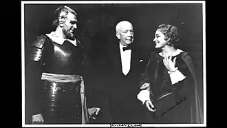 The opera was premiered at the National Theatre Munich on 24 July 1938 with Clemens Krauss conducting. The opera was performed often around Germany, with Adolf Hitler and other top Nazis attending a performance in Vienna on 10 June 1939, which formed part of the celebrations of Strauss' 75th birthday.[8][9] Performances were halted soon after the start of the second world war. In May 1949, to celebrate his 85th birthday, there were simultaneous performances of the opera in Paris and Brussels, broadcast by French radio.[10] In Germany, Friedenstag was revived in Munich in 1960 and in Dresden in 1995. Pamela Potter has performed a scholarly analysis of the pacifist and anti-war subtext of the opera.[11] The work was given its United States premiere under the direction of Walter Ducloux at the University of Southern California in 1967. The first professional production in the US took place at the Santa Fe Opera on 28 July 1988 with a cast that included Richard Lewis, Alessandra Marc, and Mark Lundberg.