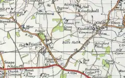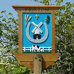 Friston is a village and civil parish in the East Suffolk district, in the county of Suffolk, England. It is 3 miles (5 km) southeast of Saxmundham, its post town, and 4 miles (6 km) northwest of Aldeburgh. The River Alde bounds the village on the south. The surrounding land is chiefly arable. The soil becomes partly marshy in the lower grounds. The village is noted for its early nineteenth century post mill.[1] It is located next to the village of Knodishall. In 2011 the parish had a population of 344.