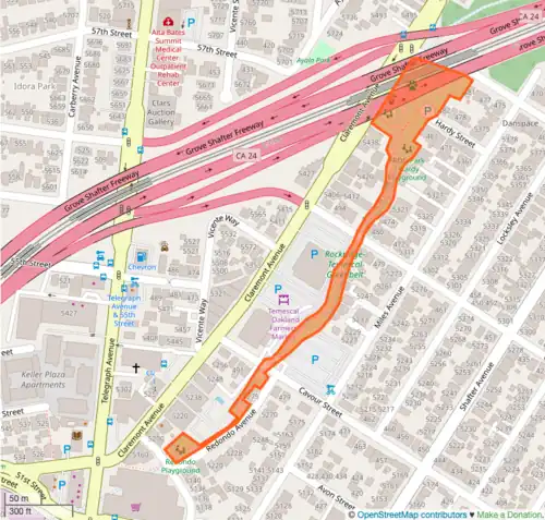 - ^ Further details (not included in this article) about the community organizing and deliberation process can be found in: Nelson, Theresa (November 7, 1998). "DMV to Stay on Claremont; Park Still Alive". The Rockridge News. Vol. 13, no. 10 (140). p. 1.; "DMV Plans". The Rockridge News. December 5, 1998. p. 3.; Bogart, Michael (February 6, 1999). "The Case Against a DMV Park". The Rockridge News. Vol. 14, no. 2. p. 7.; Lerner, Raissa; Hollingsworth, Peter (February 6, 1999). "The Case for a DMV Children's Park". The Rockridge News. Vol. 14 (143), no. 2. p. 1.; RCPC [Rockridge Community Planning Council] Board of Directors (May 8, 1999). "Let's Create a Wonderful Park for Rockridge and Tesmescal Neighbors - On April 8, the RCPC Board of Directors voted unanimously to build a park at the Department of Motor Vehicle site on Clarement". The Rockridge News. p. 3.; Hollingworth, Peter (June 5, 1999). "Park Efforts Center on Creek - A linear park along Temescal Creek may be the ideal solution for the Rockrdige park proposal". The Rockridge News. Vol. 14, no. 6.; "Council Votes Rockridge Park Funds". The Rockridge News. Vol. 14, no. 7. July 10, 1999. p. 1.; Carol McClellen, RCPC Parks Committee Co-Chair (October 2, 1999). "Planning Begins for a Rockridge Park". The Rockridge News. p. 4.; Fitzhugh, Sally (January 6, 2001). "Rockridge Park Development Funding at a Critical Juncture". The Rockridge News. Vol. 16, no. 1 (164). p. 1.: "Put Your Mark on The Park - There's Still Time to Volunteer". The Rockridge News. October 6, 2001. p. 4.