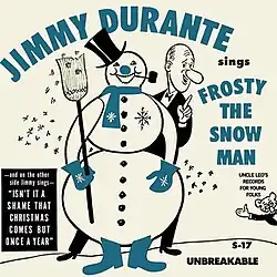 "Frosty the Snowman" is a song written by Walter "Jack" Rollins and Steve Nelson, and first recorded by Gene Autry and the Cass County Boys in 1950 and later recorded by Jimmy Durante in that year.[3] It was written after the success of Autry's recording of "Rudolph the Red-Nosed Reindeer" the previous year. Rollins and Nelson shopped the new song to Autry, who recorded "Frosty" in search of another seasonal hit. Like "Rudolph", "Frosty" was subsequently adapted to other media including a 1969 television special.