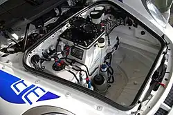 A racing fuel cell has a rigid outer shell and flexible inner lining to minimize the potential for punctures in the event of a collision or other mishap resulting in serious damage to the vehicle. It is filled with an open-cell foam core to prevent explosion of vapor in the empty portion of the tank and to minimize sloshing of fuel during competition that may unbalance the vehicle or cause inadequate fuel delivery to the motor (fuel starvation).[4]