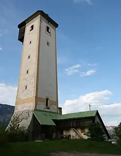 Brass was only hammered at the complex under 1530[1] and from 1547 onwards the family began to retreat from the Hungarian mining industry and to concentrate on domestically-mined ores, which left the Fuggerau with less and less importance. The brothers Marx and Hans Fugger sold the Fuggerau, all its properties and rights and even its equipment and furniture back to the Abbey in 1570 for 2500 guilders during the abbacy of Petrus von Arnoldstein. The buildings fell into ruin and the local population forgot the name 'Fuggerau' - in 1688 the ruins are shown in a view by Valvasor.[1] The Schrotturm Gailitz was built on the ruins in 1814, before being replaced by another tower of the same name in 1830, which operated until 1974 and still survives today.[5][6][7]