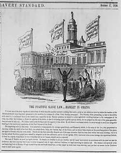 Several years before, in the Jerry Rescue, Syracuse abolitionists freed by force a fugitive slave who was to be sent back to the South and successfully smuggled him to Canada.[22] Thomas Sims and Anthony Burns were both captured fugitives who were part of unsuccessful attempts by opponents of the Fugitive Slave Law to use force to free them.[23] Other famous examples include Shadrach Minkins in 1851 and Lucy Bagby in 1861, whose forcible return has been cited by historians as important and "allegorical".[24] Pittsburgh abolitionists organized groups whose purpose was the seizure and release of any enslaved person passing through the city, as in the case of a free Black servant of the Slaymaker family, erroneously the subject of a rescue by Black waiters in a hotel dining room.[8] If fugitives from slavery were captured and put on trial, abolitionists worked to defend them in trial, and if by chance the recaptured person had their freedom put up for a price, abolitionists worked to pay to free them.[25] Other opponents, such as African-American leader Harriet Tubman, treated the law as just another complication in their activities.