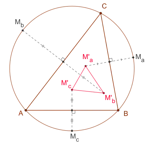 For a given triangle and its circumcircle the midpoints of the arcs over triangle sides are denoted by . Those midpoints get reflected at the associated triangle sides yielding the points , which forms the Fuhrmann triangle.[1][2]