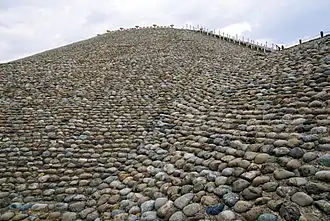 The material for fukiishi was often made up of pebbles and stones from dry riverbeds. In the case of pebbles, a variety of stones was used. For example, the late-4th-century Matsuokayama Kofun in Kashiwara in Osaka Prefecture was made with andesite flagstones in vertical or sloped piles.[11] Other sites used chert, sandstone, slate, basalt, or other types of stone.