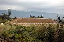 At the beginning of the 6th century, the scale of most keyhole-shaped kofun west from the Kantō region became smaller, the smaller Baichō ("satellite") tumuli began to disappear, and fukiishi began to be used infrequently. Three-tiered kofun saw a strong decrease in favour of two-tiered ones. Outside of the Kantō region, haniwa stopped being used.[15] From the end of the 6th century to the beginning of the 7th, the tumuli of the monarchs changed from square hōfun tumuli to octagonal hakkaku-fun tumuli.[16] Amongst these, jōenkahōfun dome-shaped grave mounds made with fukiishi, such as Musashi Fuchū Kumano Jinja Kofun in Fuchū in Tokyo, are noteworthy. Nevertheless, during this era kofun were quickly ceding the role of central ritual building to Buddhist temples, and the adoption of rammed earth construction techniques stands out.