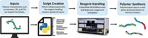 - ^ a b Rojas, Ramiro; Harris, Nicole K.; Piotrowska, Karolina; Kohn, Joachim (January 2009). "Evaluation of automated synthesis for chain and step-growth polymerizations: Can robots replace the chemists?". Journal of Polymer Science Part A: Polymer Chemistry. 47 (1): 49–58. Bibcode:2009JPoSA..47...49R. doi:10.1002/pola.23119.