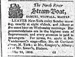 The North River Steamboat or North River, colloquially known as the Clermont, is widely regarded as the world's first vessel to demonstrate the viability of using steam propulsion for commercial water transportation.[2] Built in 1807, the North River Steamboat operated on the Hudson River – at that time often known as the North River – between New York City and Albany, New York. It was built by the wealthy investor and politician Robert Livingston and inventor and entrepreneur Robert Fulton (1765–1815).