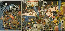 Kyu Hyun Kim writes that some prints, for example Utagawa Kuniyoshi's Prince Minamoto Yorimitsu Encounters the Earth Spider Demon (1843), were "purported to depict mythical heroes from kabuki plays, who were in fact identifiable to contemporaries as satirical representations of real-life shogunate officials and domain lords".[4] Another example is The great battle between the fruit and vegetable army and the fish troops, 1859 by Utagawa Hirokage, that appears to be: